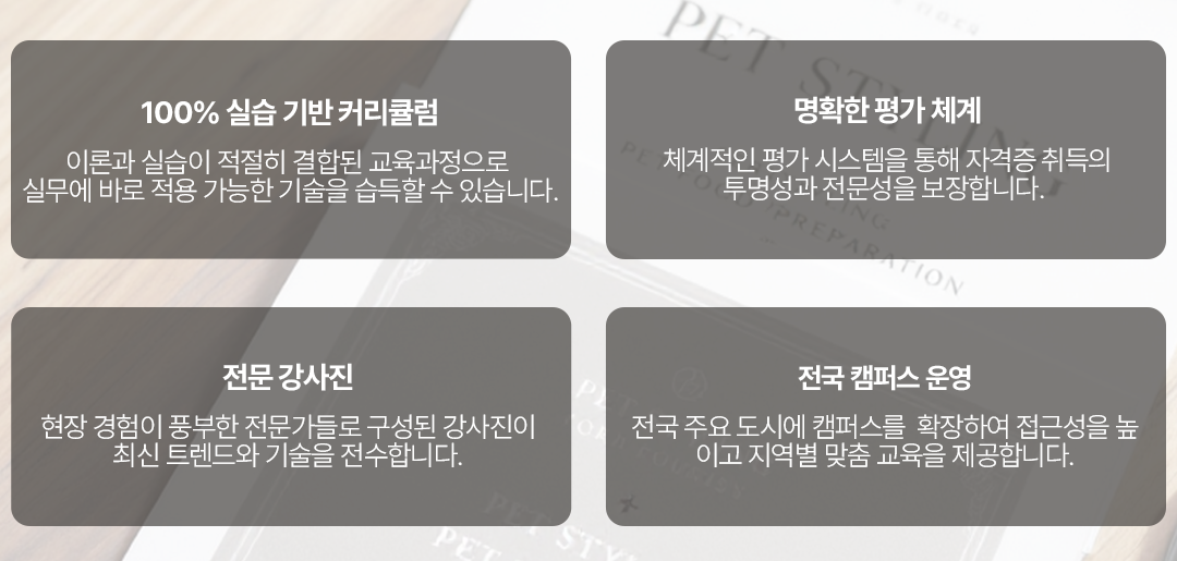 퍼스트 펫 아카데미는 반려동물 미용과 펫푸드 분야의 실무형 전문가를 양성하는 종합 교육기관입니다.